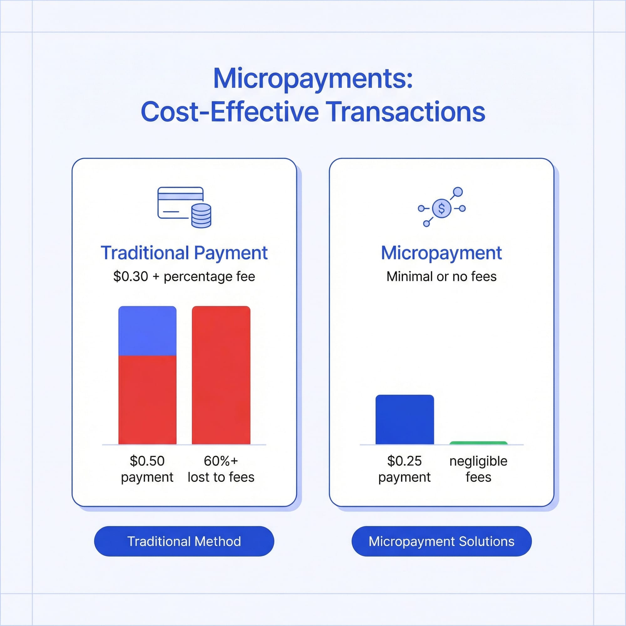 - Traditional payment fees (often $0.30 + percentage) make small transactions uneconomical; for example, a $0.50 payment loses 60%+ to fees alone.